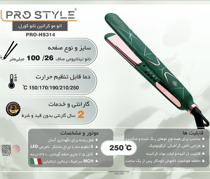 همچنین طول سیم 2.5 متری با قابلیت چرخش 360 درجه ( روتوکورد ) برای راحتی اتوکشی در سالن های آرایشی بسیار کاربردی است. از دیگر مشخصات اتو مو می توان به قفل کنترل دما جهت جلوگیری از تغییر دما در زمان صاف کردن مو، سیستم خاموش شدن خودکار، صفحه نمایشگر LCD، قابلیت تنظیم حرارت بین 150 تا 250 درجه نیز اشاره کرد. همچنین این اتو مو مجهز به عایق الکتریسیته و عایق حرارت می باشد که با مقاومت بالا در برابر حرارت باعث ایمنی و طول عمر بیشتر دستگاه می شود. این اتو مو 260 گرم وزن دارد که به عنوان اتو مو کراتینه بسیار عالی برایصاف کردن مو ، گزینهای مناسب برای استفاده در خانه و سالنهای حرفهای است